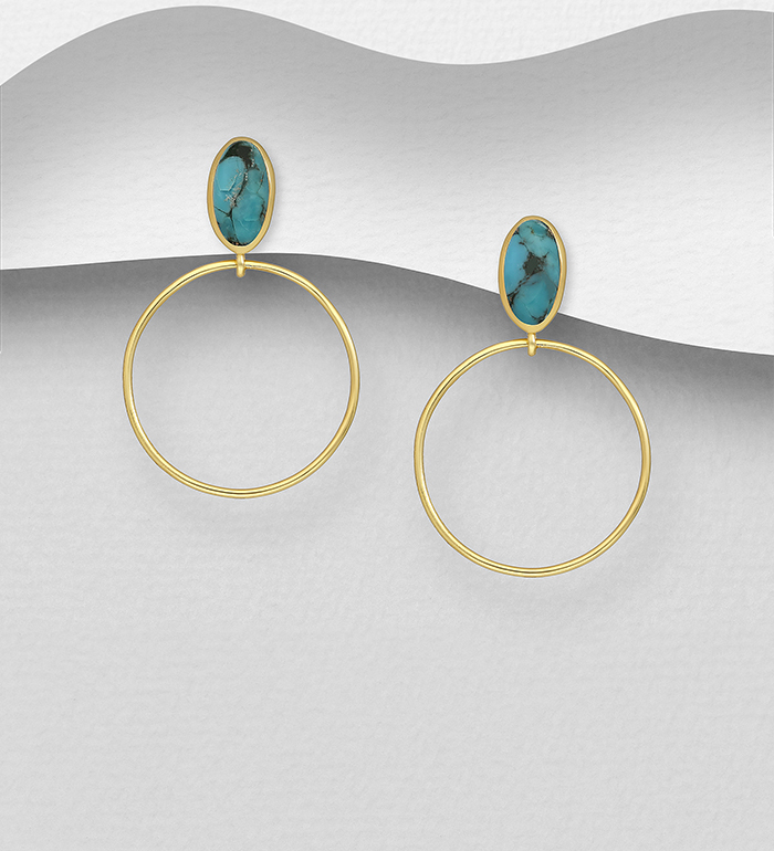 Hermosos aretes de Plata Italiana 925 con Enchapado de Oro Amarillo 18K y Piedra Preciosa Turquesa de Cobre Reconstruida, Cierre de Mariposa.