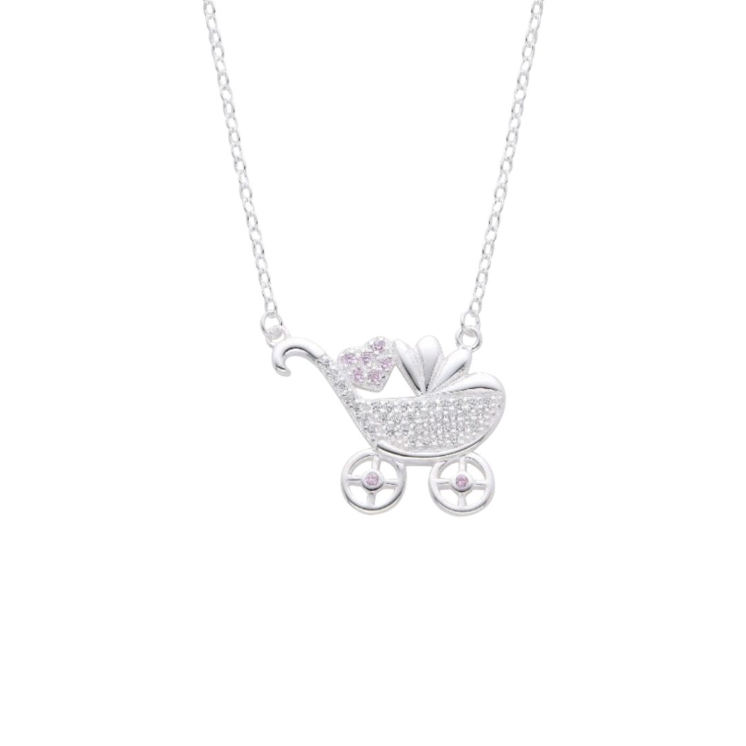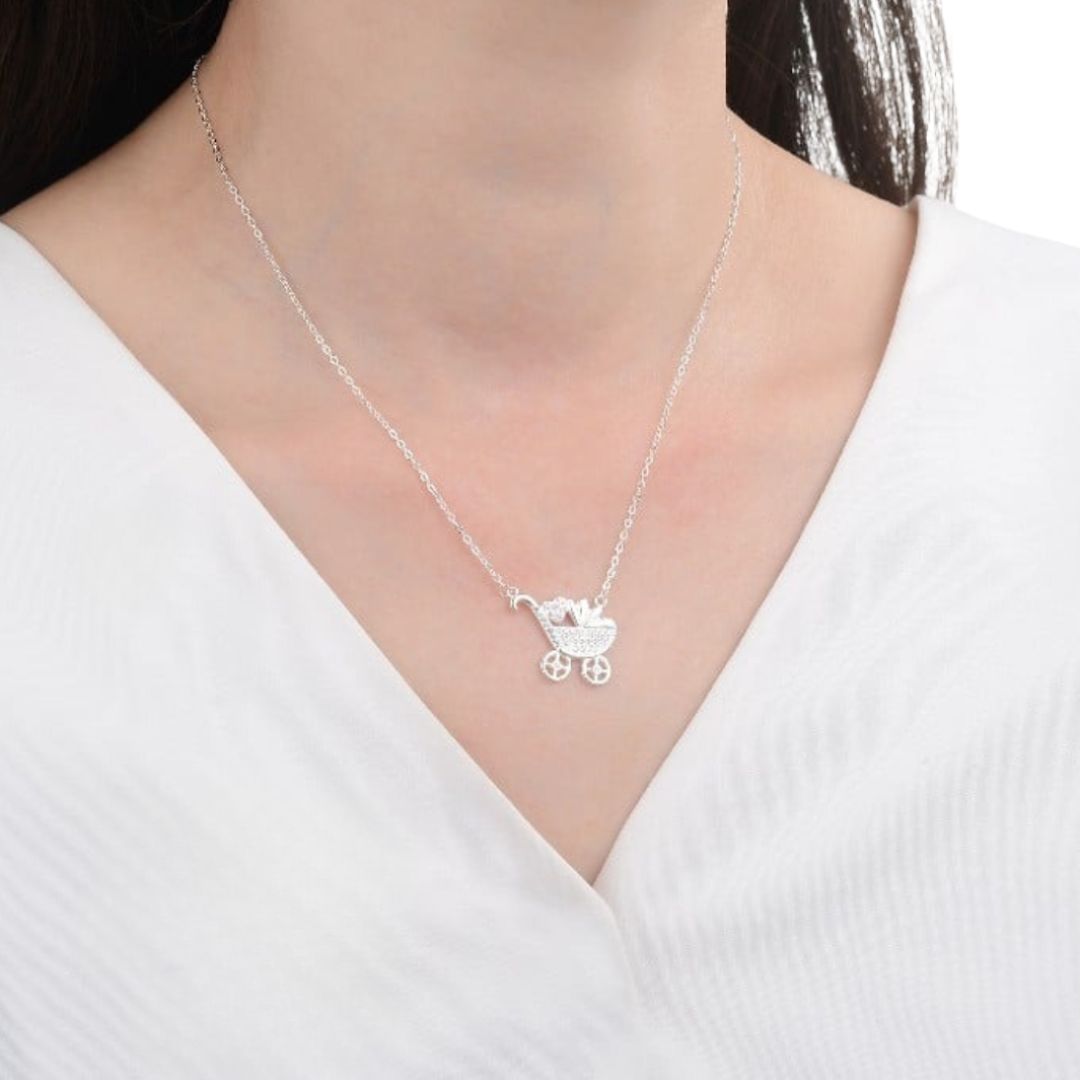 Hermosa Gargantilla Carriola de Bebe 42+3cm, Plata Italina 925