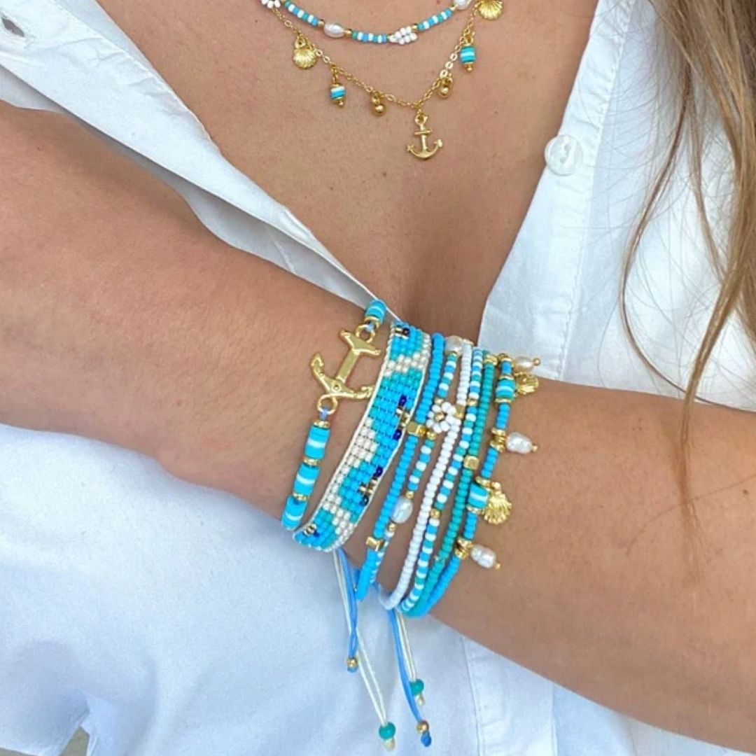 Hermoso Juego Aretes y Pulseras Celeste Ancla con Piedra Japonesa Miyuki y Baño de Oro Hecho a mano