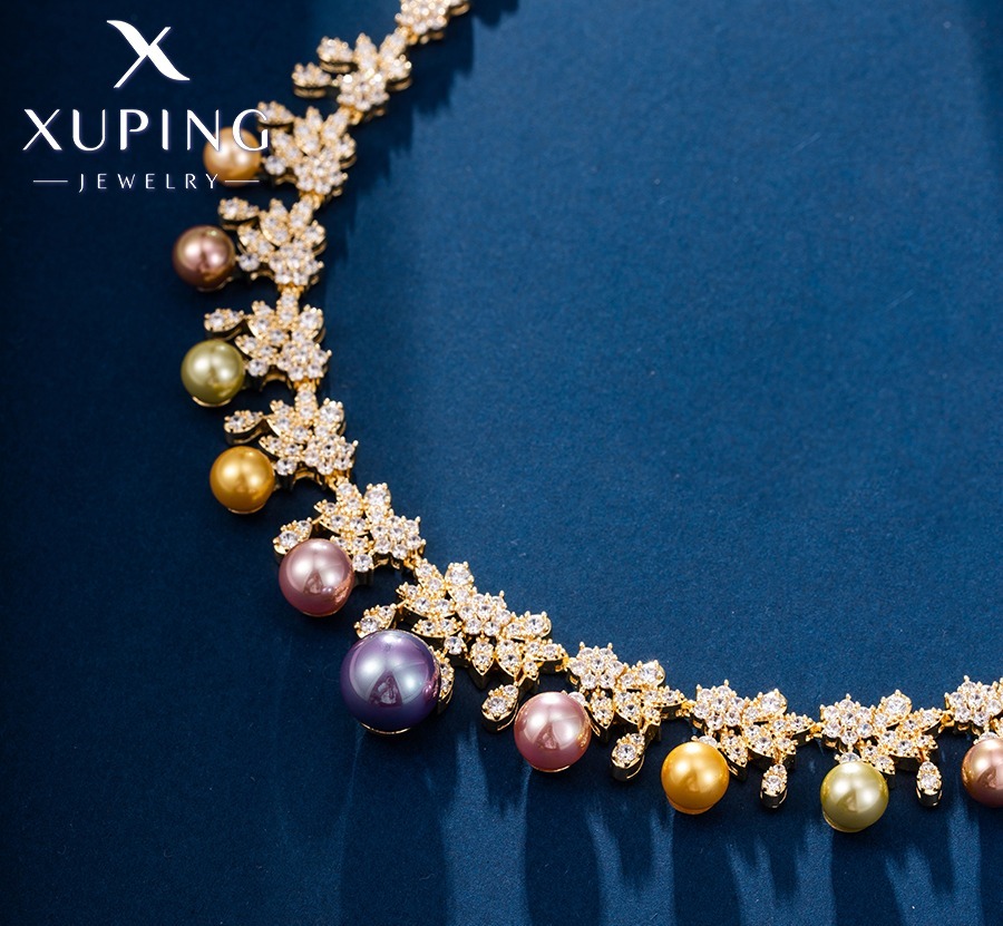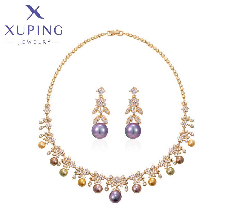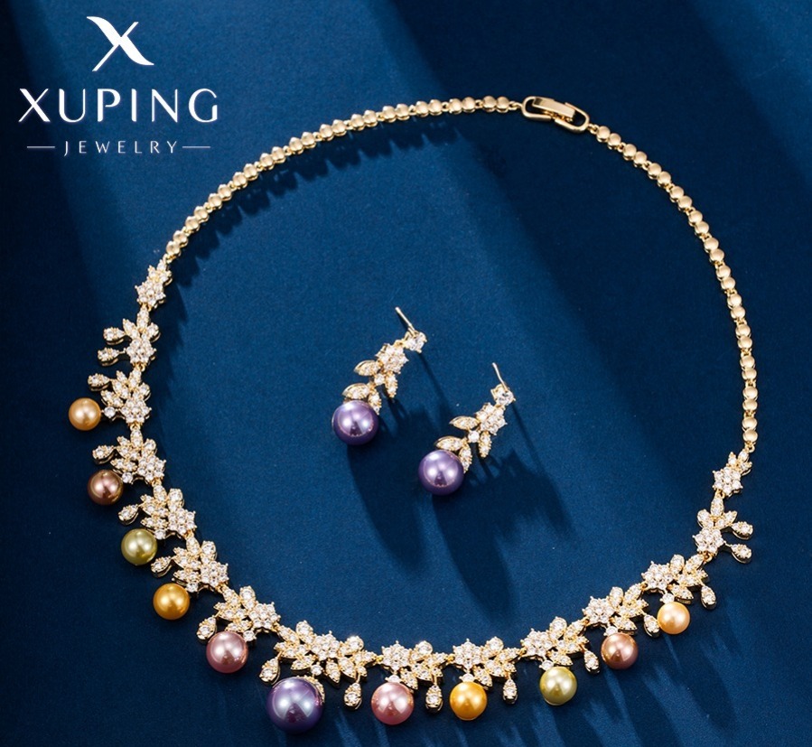 Hermosa y Elegante Conjunto de Piezas para Lucir Radiante Juego de Lujo de Perlas Gargantilla y zarcilloS, Baño de Oro Xuping .