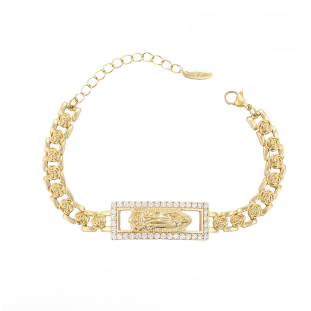 Hermosa Pulsera de Baño de Oro 14k, 17.5 cms con rosas y circonias.